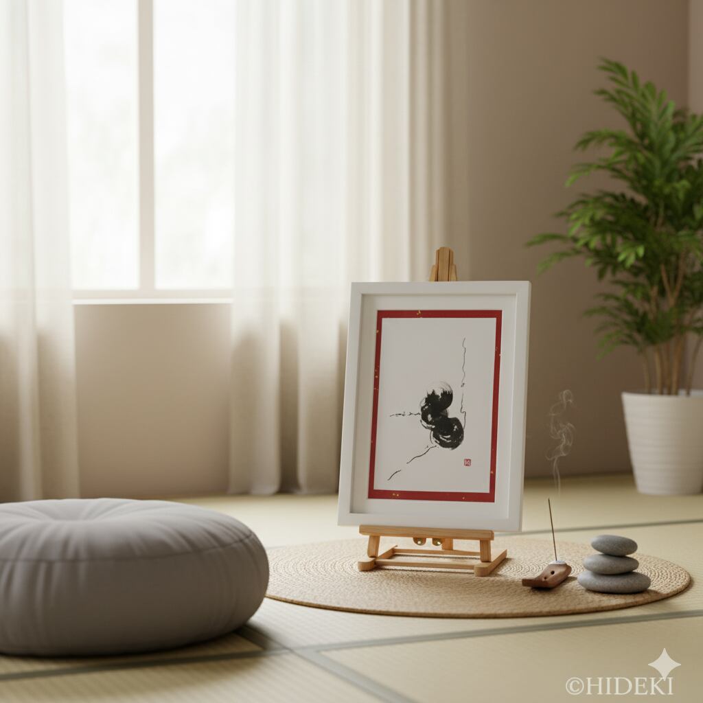 赤の背景に金箔が散らされた気品ある額装は、社長室のデスクサイドや、新たなアイデアを練る書斎にふさわしい風格を備えています。