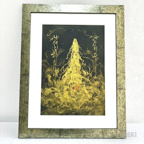 地から湧き上がるようなエネルギーがうねりを上げ、神聖な光となって天へと昇りゆく「金の龍神」を描いた直筆・一点物の原画です。