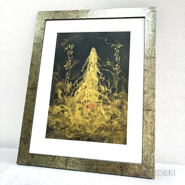 濃密な墨の背景から浮き上がる黄金の龍神は、迷いや停滞を焼き尽くし、新たなステージへと導く「昇華」の力を象徴しています。アクリル絵具の重厚な質感と、筆致に宿る躍動感が、空間に圧倒的な存在感をもたらします。