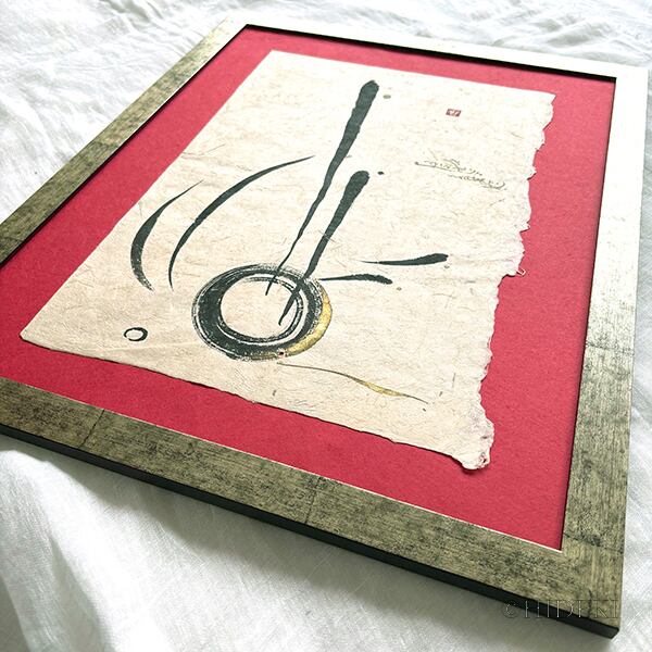 中央を貫く力強い垂直のラインは「確信」と「意志」を。それを受け止める円(エン)は、結実した「成果」と「調和」を象徴しています。和紙の断裁面に残る「耳」の質感が、命の脈動と自然の力強さを際立たせ、見るたびに持ち主の視座を高め、本来進むべき輝かしい未来へと意識をフォーカスさせます。