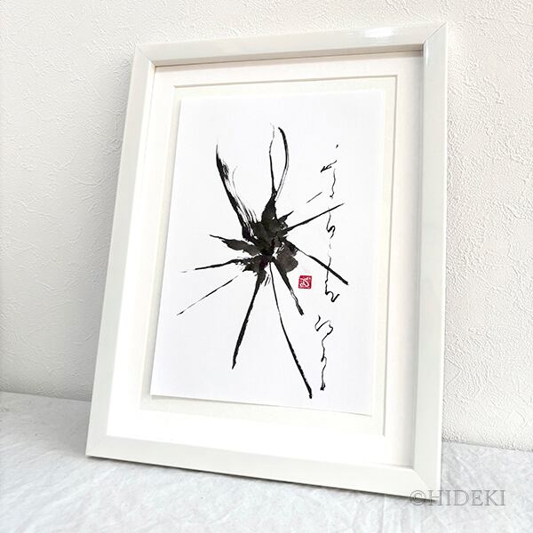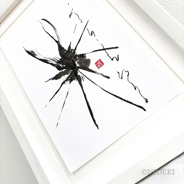 中心から爆発的に広がる墨の造形は、執着から解放された魂が解き放つ、純粋なエネルギーを表現しています。周囲に伸びる鋭い線は、全方位へと広がる自由な可能性そのもの。自らの限界を突破し、次のステージへ進もうとする経営者や、真の精神的自立を目指す方に捧げる守護アートです。